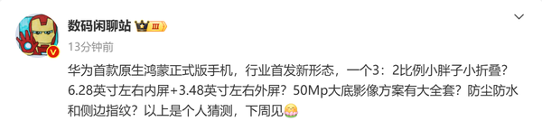 华为新形态手机配置预测:6.28英寸内屏 屏幕比例3:2 |
